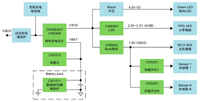 隨著技術(shù)的飛速發(fā)展,智能指環(huán)作為新興智能可穿戴設(shè)備越來越被品牌廠商所關(guān)注。中國穿戴廠商華米在CES 2024期間發(fā)布了名為Helio Ring的智能指環(huán)新品;韓國三星電子于2024年7月正式發(fā)售指環(huán)產(chǎn)品Galaxy Ring,市場反響熱烈。智能指環(huán)既有裝飾潮品的時尚屬性,又是智能手機(jī)的輔助智能感知配件,用于人體健康數(shù)據(jù)的監(jiān)測。相比手表和手環(huán),指環(huán)更貼合皮膚,因此在收集人體基礎(chǔ)生物信息,如脈搏、心率、血氧、心電圖,以及監(jiān)測體溫等方面更有精準(zhǔn)度優(yōu)勢。指環(huán)相比智能手表,還有無感佩戴的特點(diǎn),更能滿足用戶的差異化需求。智能指環(huán)受限于空間尺寸,配備的鋰電池容量通常在15~23mAh,而續(xù)航時間則需要達(dá)到5天或更久。因此,超低功耗且超小尺寸的芯片必為產(chǎn)品開發(fā)者所青睞。賽微微電(CellWise)已經(jīng)量產(chǎn)多款超低功耗的小尺寸電源芯片,如Figure1所示,都非常適用于智能指環(huán)應(yīng)用。Figure 1.智能指環(huán)電源方案線性充電器-CW6308、CW6305/6307CW6308是一款支持I2C接口和電源路徑管理的線性充電芯片,尺寸為業(yè)內(nèi)最小,充電電流最大支持320mA。在僅有電池供電并開啟Watchdog功能后,芯片工作電流仍低至5μA。CW6308還支持500nA超低功耗模式和300nA船運(yùn)模式,封裝為WLCSP-9,尺寸為1.24mm*1.24mm。CW6305/6307功能與CW6308一致,區(qū)別是可支持最大470mA充電電流,芯片封裝尺寸為WLCSP-9,1.55mm*1.55mm。電量計-CW2215單節(jié)鋰電池電量計CW2215的工作電流僅為5μA,是業(yè)內(nèi)最低,內(nèi)置高精度ADC,支持電壓、電流和溫度監(jiān)測。芯片內(nèi)置“FastCali”算法,結(jié)合對客戶電池樣品建模測試提取的電池特征參數(shù),可完成對電池剩余電量(SOC)、循環(huán)數(shù)(Cycle)和電池健康(SOH)的精確計算,并可配置對低電量、高溫或低溫的情況進(jìn)行中斷上報。CW2215為WLCSP-9封裝,尺寸為1.58mm*1.53mm。LDO低壓差穩(wěn)壓器-CW6004CW6004是一款超低功耗LDO,靜態(tài)工作電流低至300nA。其輸入電壓1.6V~5.5V,輸出電壓有1.1V, 1.2V, 1.5V, 1.8V, 2.5V, 2.8V, 3.0V和3.3V可選,輸出電流為200mA。CW6004具有快速的動態(tài)響應(yīng)特性,當(dāng)設(shè)備從Standby輕載快速切換到Active重載的工作場景下,VOUT輸出電壓也能保持穩(wěn)定。該芯片為DFN-4封裝,尺寸為1.0mm*1.0mm。Figure 2.  CW6004靜態(tài)電流vs輸入電壓Figure 3.  CW6004 Ground電流vs 輸出電流Buck降壓轉(zhuǎn)換器-CW6602、CW6603CW6602是一款超低功耗Buck降壓轉(zhuǎn)換器,輸入電壓為2.15V~5.5V,輸出電壓為1.2V~3.3V共8檔可選。其靜態(tài)工作電流低至330nA,負(fù)載電流能力為0.6A/峰值電流1.0A。在1.8V輸出電壓時,芯片的重載效率達(dá)90%以上,100uA輕載的效率也可達(dá)85%。該芯片具有快速的負(fù)載動態(tài)響應(yīng)能力,封裝為WLCSP-8,尺寸為1.575mm*0.825mm。CW6603的功能和尺寸與CW6602一致,區(qū)別是輸出電壓范圍為0.6V~1.2V。Figure 4.CW6602 Vout=1.8V的轉(zhuǎn)換效率負(fù)載開關(guān)-CW3301CW3301是一款超低MOS導(dǎo)通電阻的負(fù)載開關(guān),輸入電壓為1.1V~5.5V,最大通流能力2.0A。芯片的輸出電壓擺率(slew-rate)受控,有效保護(hù)后級芯片;CW3301具有業(yè)內(nèi)領(lǐng)先的5nA On-State靜態(tài)工作電流和12nA Off-state漏電流,并支持輸出快速放電可選;其封裝為WLCSP-4,尺寸為0.76mm*0.76mm。鋰電保護(hù)-CW1011CW1011為單節(jié)鋰電池保護(hù)芯片,支持高精度過壓、欠壓、充電過流、放電過流和短路保護(hù)。芯片內(nèi)部集成了54mΩ導(dǎo)通電阻的Dual MOSFETs;其靜態(tài)工作電流為2.5μA,并支持休眠模式,功耗低至20nA。CW1011的封裝為DFN-6,尺寸為2.0mm*1.5mm。賽微微電(CellWise)深耕超低功耗電源技術(shù)多年,在智能手表、TWS耳機(jī)、主動手寫筆、無線藍(lán)牙鍵鼠等可穿戴設(shè)備和數(shù)碼配件上擁有眾多design wins。今天介紹的這些電源芯片,一定也可以助力各品牌廠商和方案開發(fā)者,實現(xiàn)智能指環(huán)的更小空間堆疊、更長電池續(xù)航和更優(yōu)用戶體驗。感謝大家對賽微微電公司和產(chǎn)品的持續(xù)關(guān)注。